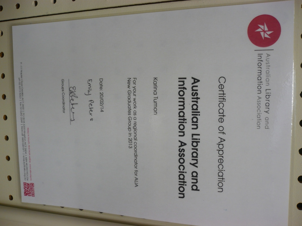 - I have recently stepped down as the ALIA New Grads Group Coordinator for Tasmania (below is a certificate of appreciation of my volunteer contribution to the group last year)