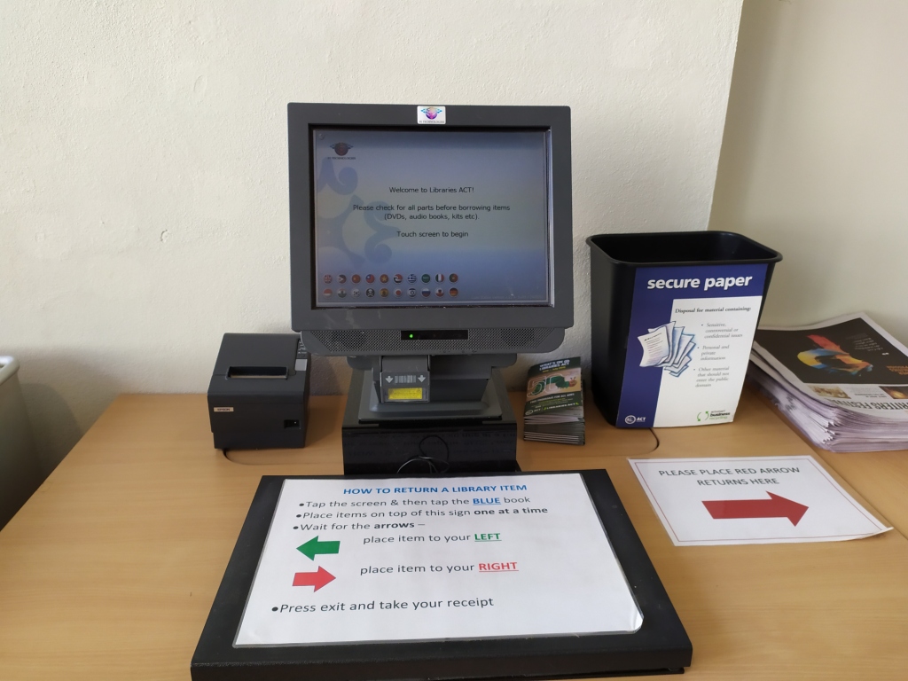 Returning library items to the library wasn’t that intuitive and there was no clear sign or direction as to where I should place them. As I looked further around the foyer, I noticed a computer which the client could use to return their borrowed items. I found this procedure/system a little clunky (PS: I have seen better self-return systems in my future library visits so I could say this was a clunky system). I’m hoping that the Woden Library has upgraded this by now – yes it has and the latest update is: Woden Library has upgraded to an external self-return chute!