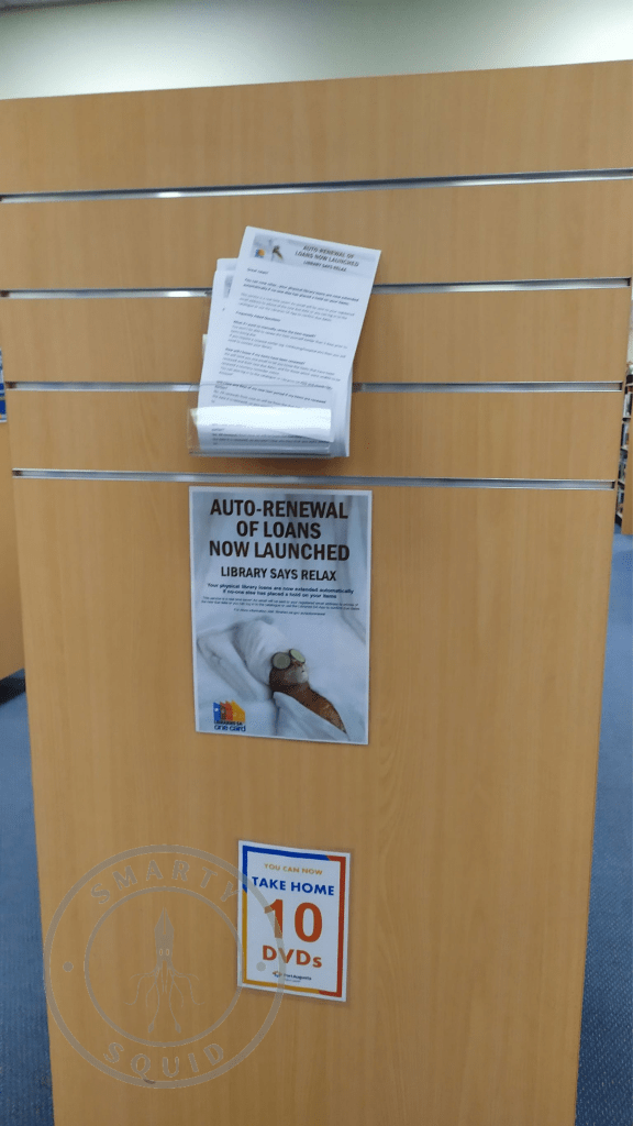 At the time of the visit, the South Australia library network was promoting the launch of their auto-renewal of loans. If you had an item out, providing that the item didn’t have a hold or reserve on it the system automatically renewed it for you. Brilliant huh?