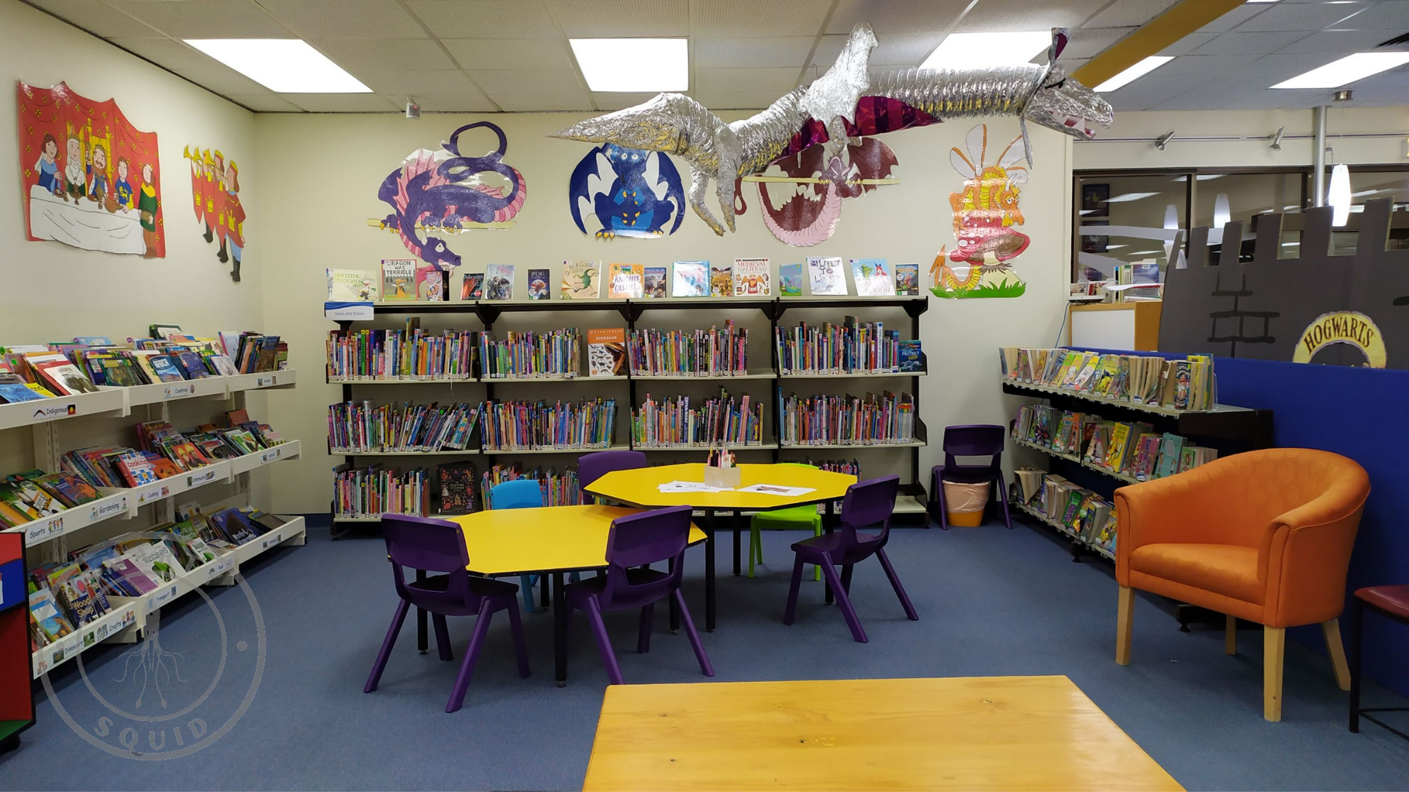 I like the library’s children’s area display when I visited. It looked like a fantasy theme where there was a paper mache and/or foil dragon hanging on the ceiling. There was also a Hogwarts castle made out of cardboard.