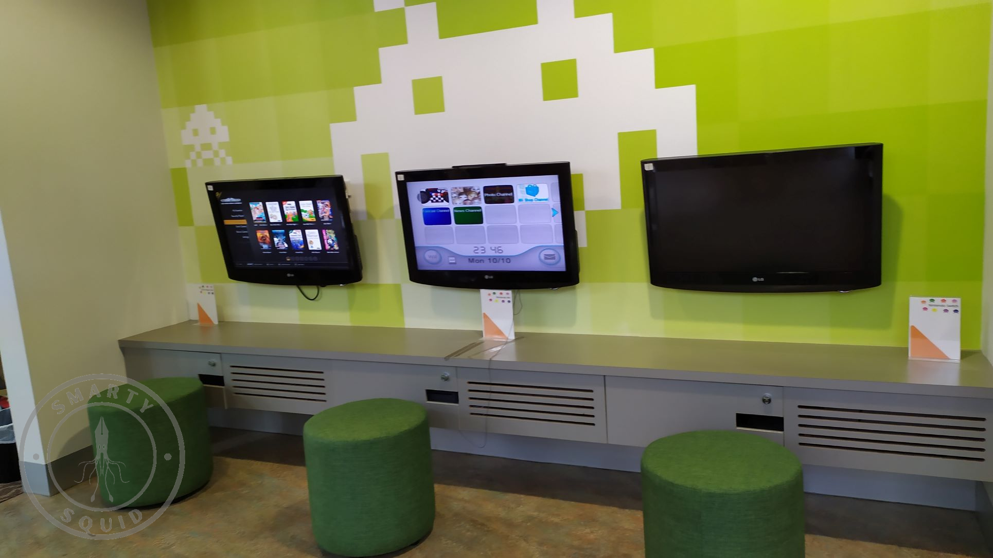 There are 3 monitors for playing video games. So cool. There are also free games (pinball type machines and chess boards) available for use by the young at heart.